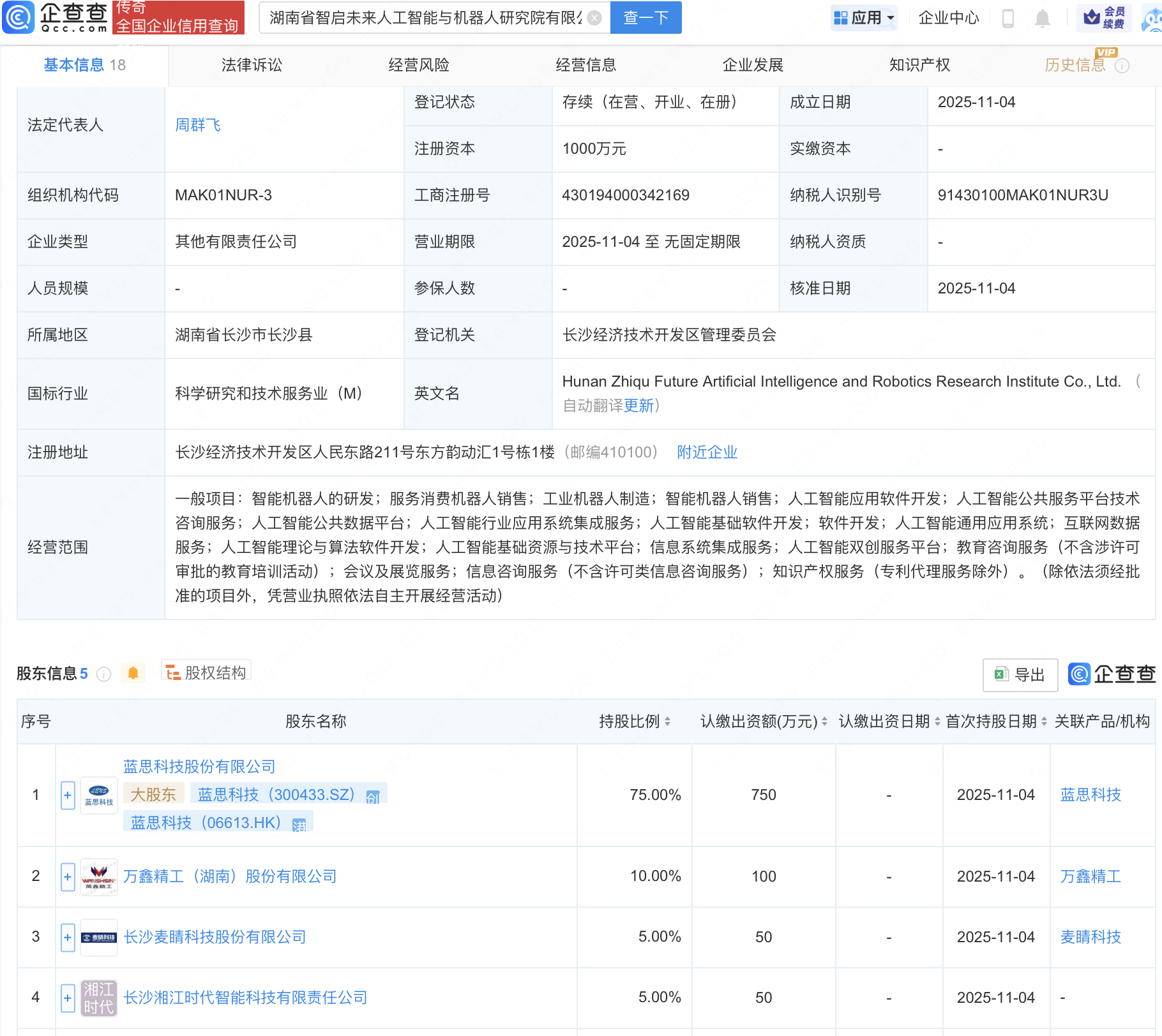 近日,湖南省智启未来人工智能与机器人研究院有限公司成立,注册资本1000万元明利配资,经营范围包含:智能机器人的研发;工业机器人制造;智能机器人销售;人工智能应用软件开发;人工智能公共服务平台技术咨询服务等。企查查股权穿透显示,该公司由蓝思科技(300433)等共同持股。