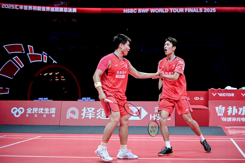 12月20日,中国组合梁伟铿(左)/王昶在比赛中庆祝得分。\n 当日,在杭州进行的2025世界羽联世界巡回赛总决赛男双半决赛中,中国组合梁伟铿/王昶2比1战胜印度组合兰基雷迪/谢提,晋级决赛。\n 新华社发