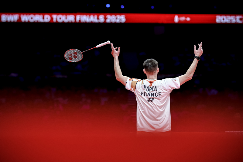 12月21日,法国选手小波波夫在决赛后庆祝夺冠。\n 当日,在杭州进行的2025世界羽联世界巡回赛总决赛男子单打决赛中,中国选手石宇奇0比2不敌法国选手小波波夫,获得亚军。\n 新华社记者 江汉 摄